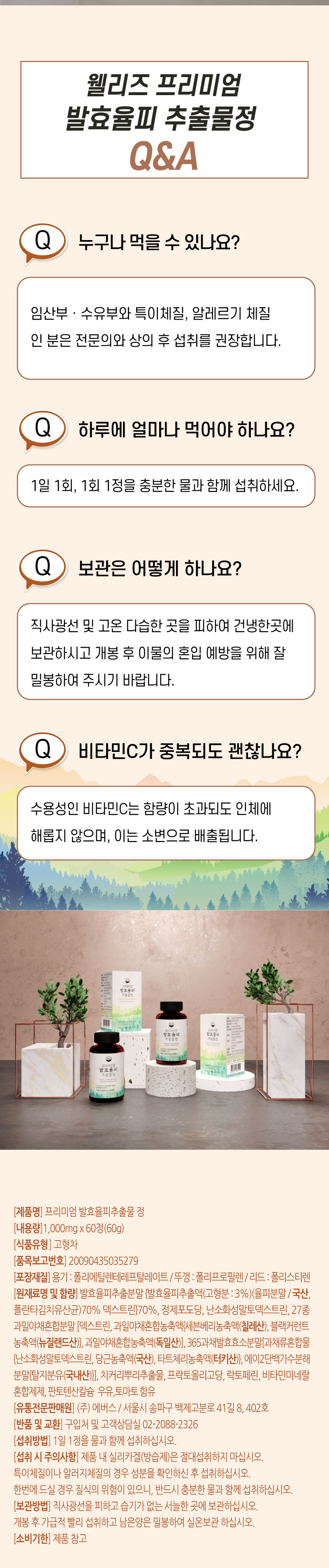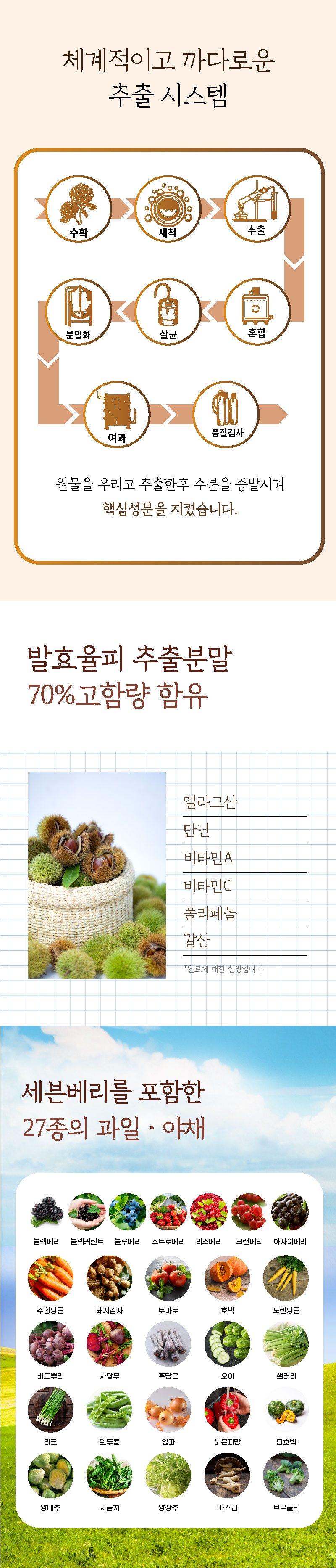 국내산 발효율피추출분말을 사용하며 엘라그산, 탄닌, 비타민A, 비타민C, 폴리페놀, 갈산이 함유되어 있습니다.